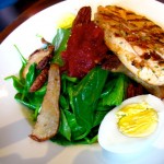 Spinach Salad with chicken, warm goat cheese, candied pecans, caramelized pears, red onion confit, boiled egg in a honey dijon vinaigrette.