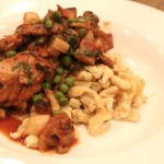 tender mocha porter braised chicken, spaetzle, rainer bacon, mushrooms, peas, pearl onions