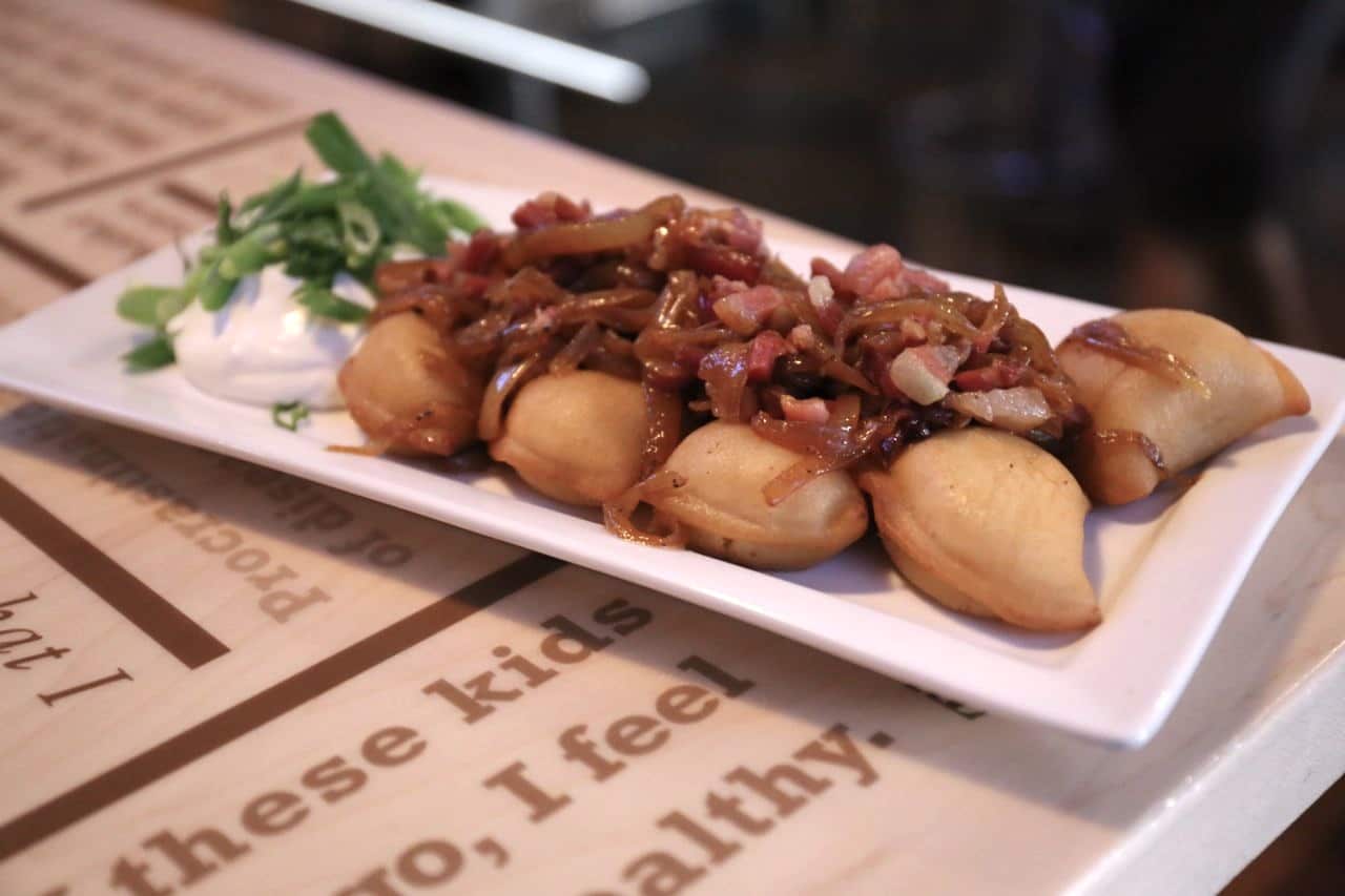 duck fat fried cheddar and potato perogies, caramelized onions, double smoked bacon, sour cream