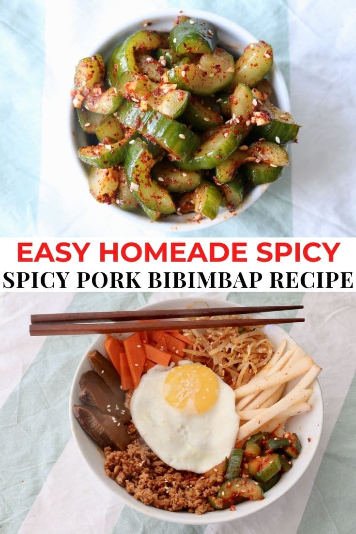 - SPICY PORK BIBIMBAP ASSEMBLY: Divide steamed rice into 4 large soup bowls or Korean hot stone bowls. Spoon bibimbap sauce over rice. Arrange cucumbers, radish, sprouts, mushrooms and carrots around the outside of the bowl. Fill the centre of the bowl with spicy minced pork. Quickly fry eggs in a pan moments before you are ready to eat. Traditionally the dish is served with sunny side up eggs as the runny yolk is mixed into the hot rice. Garish with sesame seeds and chopped scallions. Serve hot!