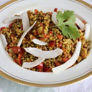 Our quick & easy Sprouted Mung Bean Salad recipe features flavourful ingredients like dried mung beans, mustard seeds, cumin seeds, onion, chili, garlic, ginger, turmeric, tomato, cilantro and coconut.