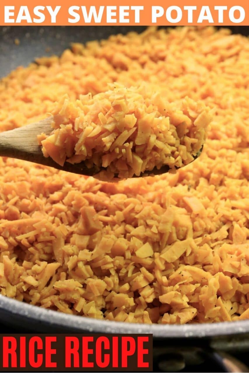 - In a large non-stick pan over medium high heat add oil and sweet potato rice. Stir continuously for 20 minutes until the sweet potato has started to brown.