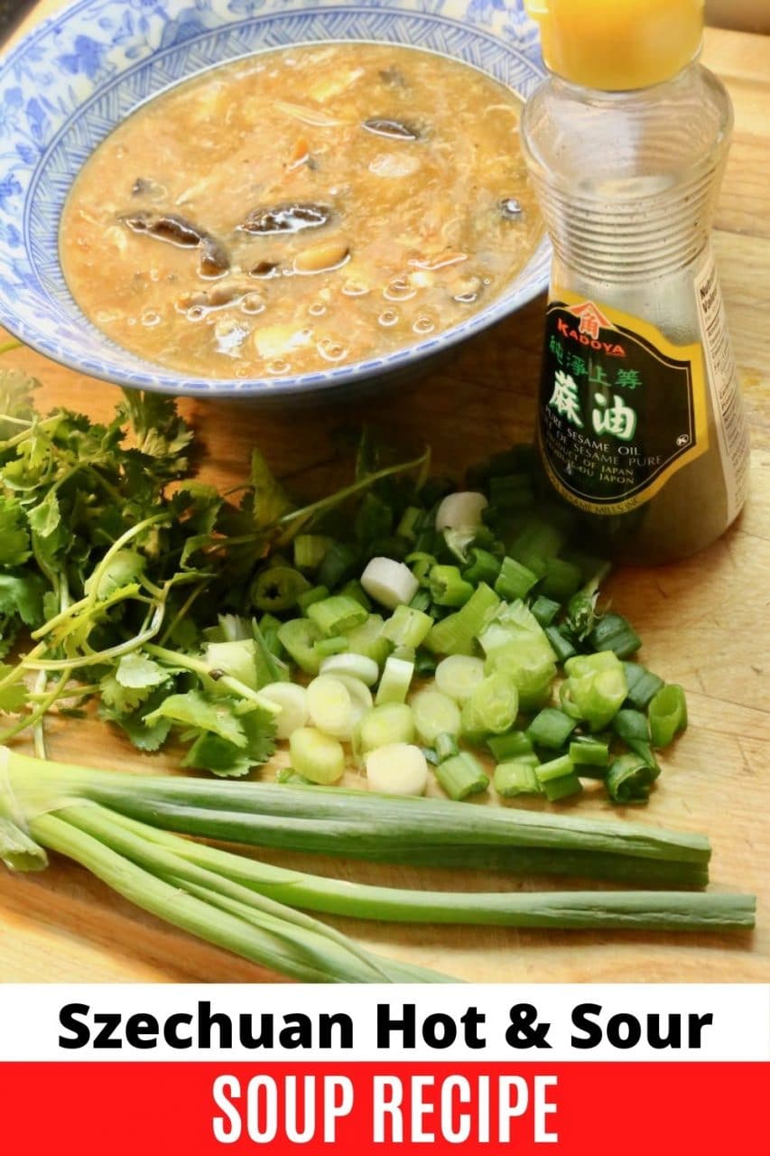 - Garnish Szechuan Hot and Sour Soup with chopped green onion, cilantro and drizzle of sesame oil.