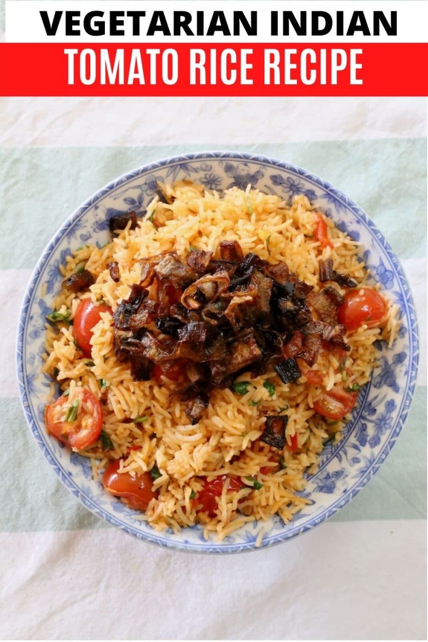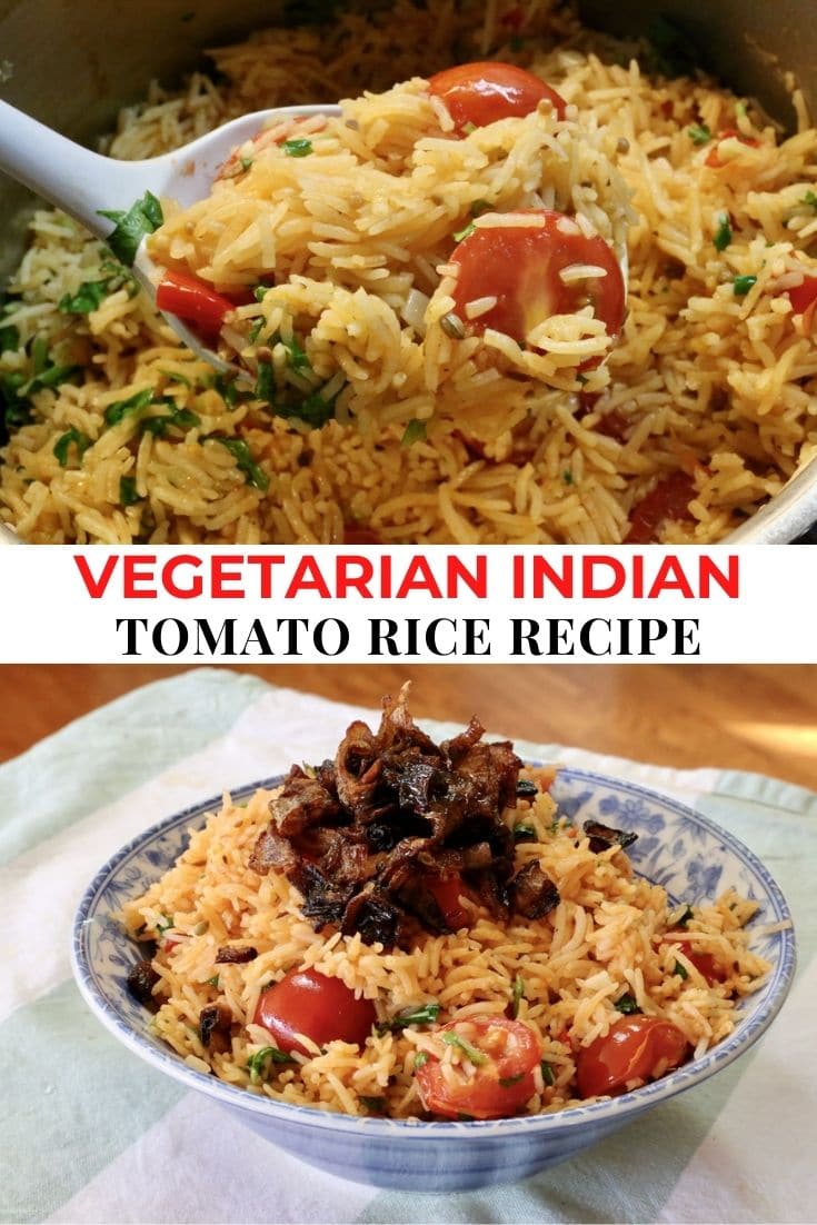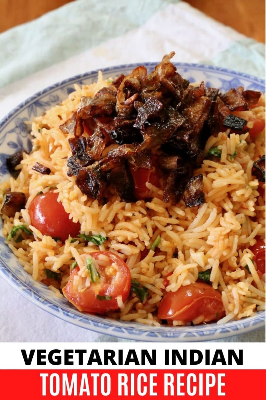 Indian rice pilaf often features meat or seafood like chicken, goat, lamb, prawn and fish. They can also be vegetarian and vegan friendly like this simple Tomato Biryani recipe.