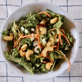 We also share directions on how to make a simple salad with the dressing, tossed together with kale, cabbage, carrots, scallions and roasted cashews.
