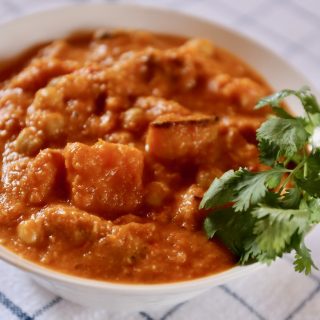 Chunks of roasted butternut squash are tossed together with protein-packed chickpeas and simmered in a creamy coconut milk sauce flavoured with fragrant spices.