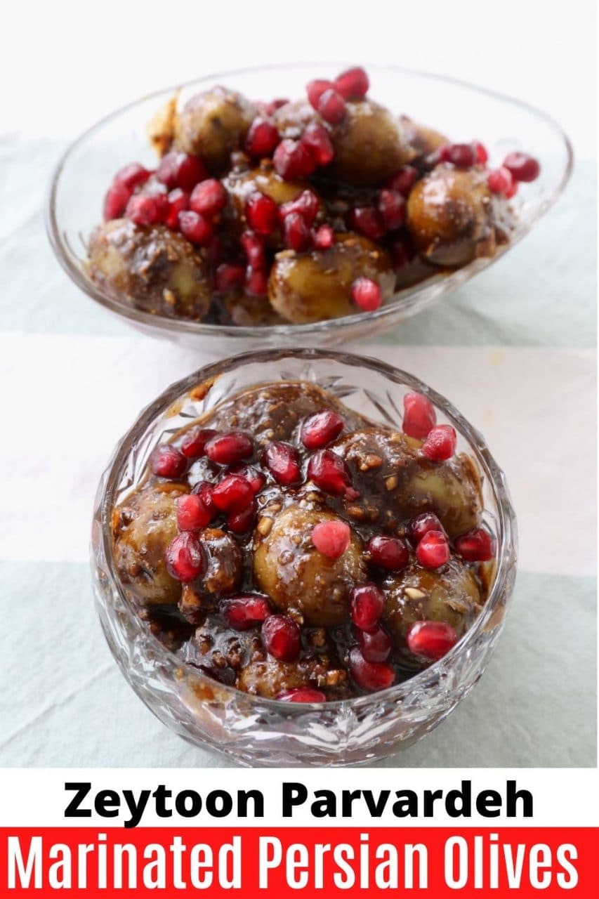 Zeytoon Parvardeh is a popular appetizer from Iran featuring large green olives that marinate in a mixture of ground walnuts, minced garlic, dried or fresh mint, pomegranate molasses and fresh pomegranate seeds.