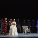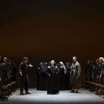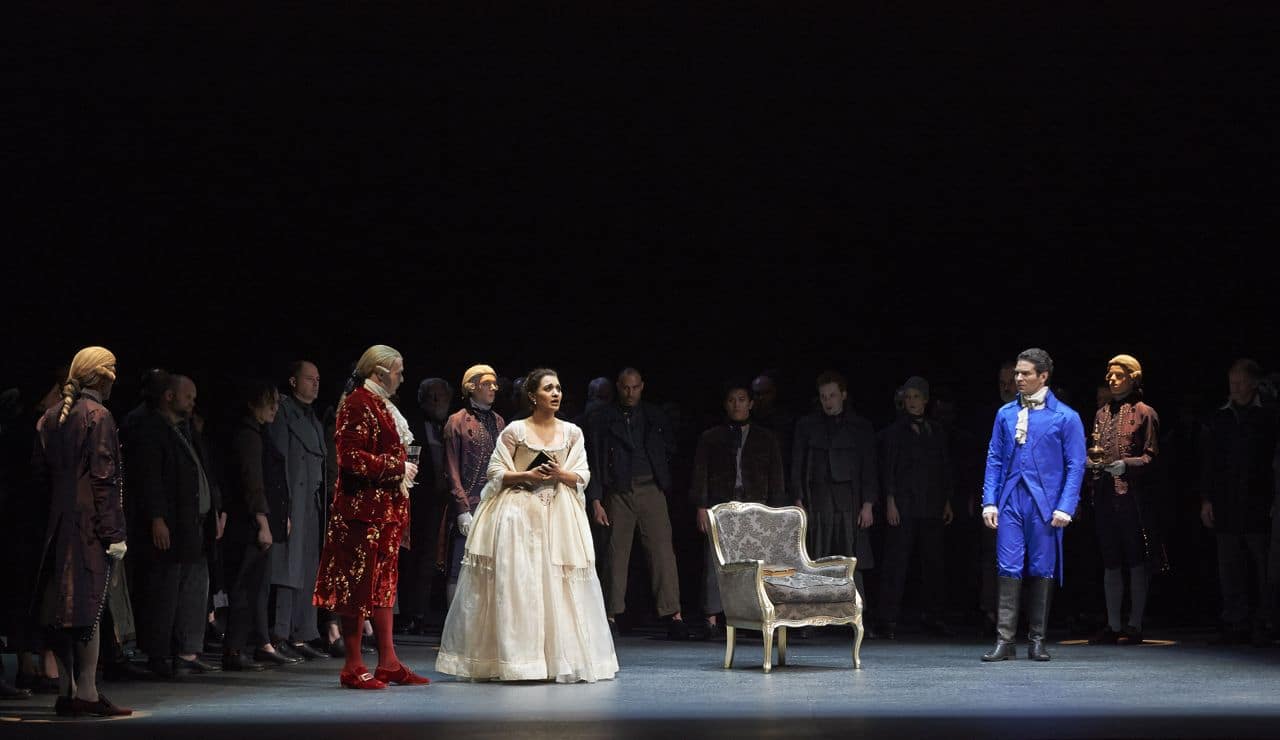 Director Robert Carsen focuses on the psychological states of the characters, using a minimalist approach. No fancy sets, or opulent outfits here. The mob of revolutionaries, consisting of over 100 create fantastic transitions as a choir that represent the political unrest in France. The staging of these bodies throughout the show was thought provoking and impactful. The first scene for example includes our main characters who appear to be talking in an intimate room within their home. These hundred or so members of the choir surround the conversation creating believable walls with hearts beating and chests heaving.