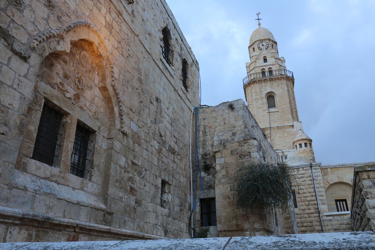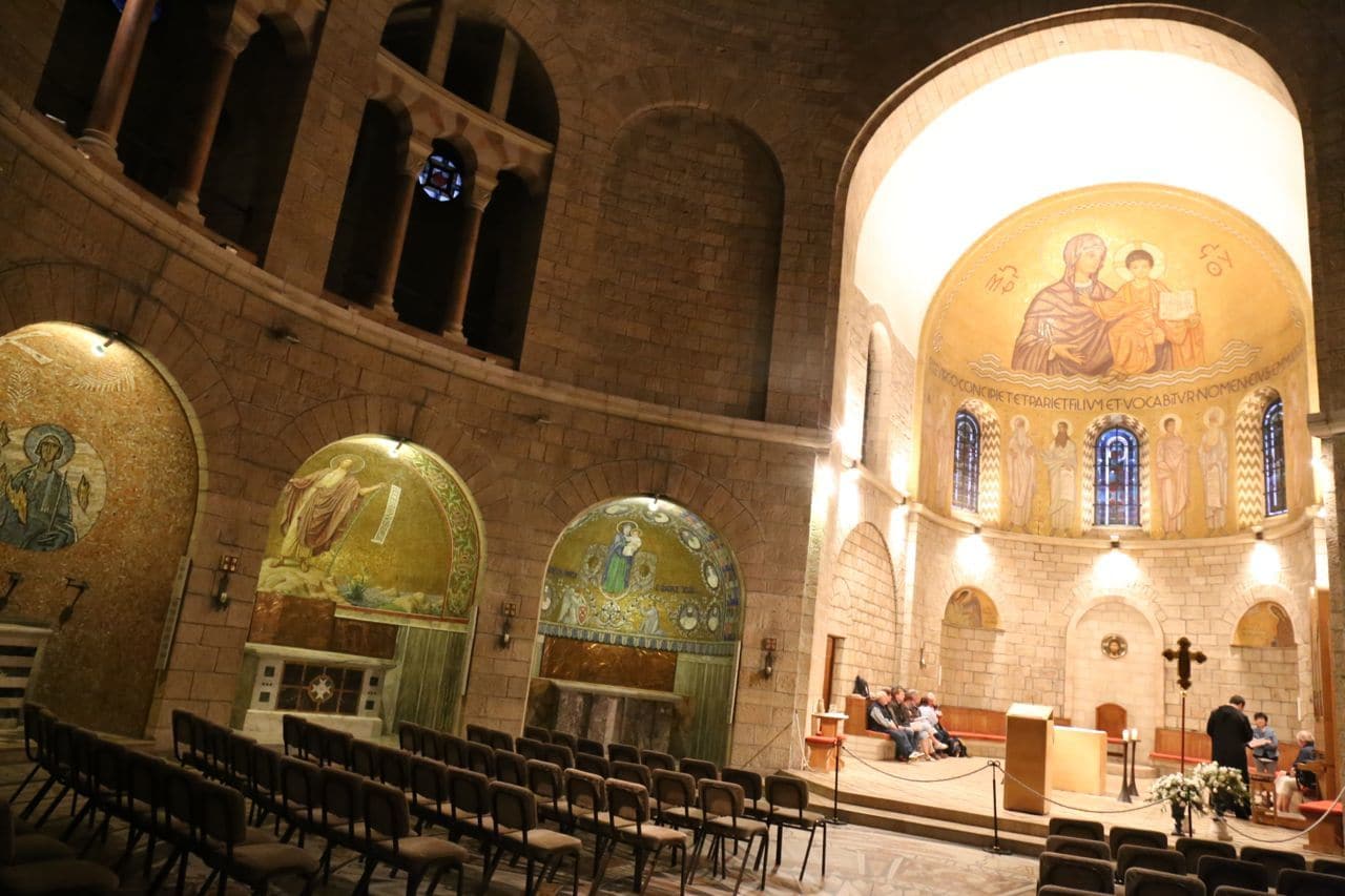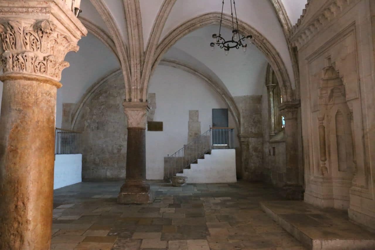 Southwest of the Old City, Mount Zion is recognizable by the distinctive conical roof of Dormition Abbey. This attractive white stone building was erected in 1900 and is traditionally believed to be on the site where Mary lived after her son’s crucifixion, and also the site of her death, an event marked by a mausoleum in the bright modern crypt, decorated with twelve columns. Down the Hill to the right and virtually in the shadow of the Abbey, the Coenaculum, is reputedly the room in which the Last Supper took place. Somewhat smaller than the one depicted in Leonardo da Vinci’s famous fresco, the peaceful room was actually built long after Jesus’s time, under the Crusaders, with their characteristic pointed arches.