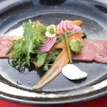 salad of shaved carrot, candy cane beets, arugula and quick-pickled green strawberries