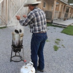 The Donahue’s prepared a fun farewell feast for my final evening at Sierra West Ranch. At large rodeo events ranchers enjoy Pitchfork Fondue where steaks are literally pierced by a pitchfork and submerged in boiling canola oil. The steaks cooked quickly and had a lovely browned crispy coating which were served with boiled potatoes topped with sour cream and bacon, corn on the cob, a slice of hearty loaf and a mixed green salad. A sweet finish featuring Angel Food Cake topped with fresh berries and sweet whipped cream provided a perfect moment for me to close my eyes, smile and clink the heels of my cowboy boots one last time.