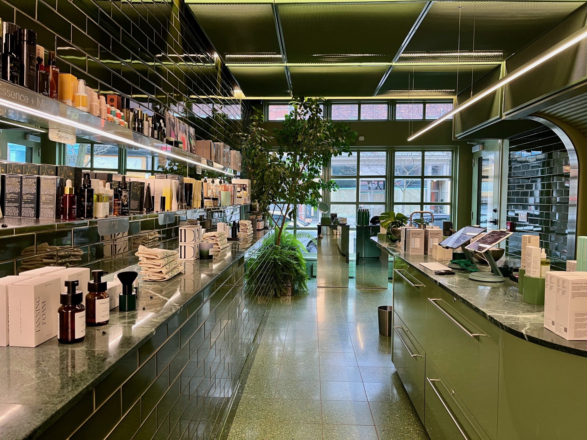 Outside the Ossington Fig, alluring green tiles beckon to passersby, while inside the modern apothecary vibe makes you feel like you’re in very good hands. After perusing the robust product offerings—from Epara to Tata Harper to Paume—I’m whisked into my adorable little pod where a comfy barber’s chair (yes, it’s fig green) awaits me.