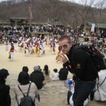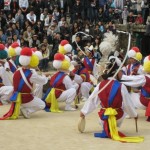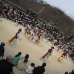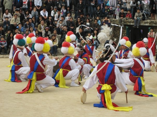 Dale and I ran across the stepping stones across the river and sat down at the outdoor performing art coliseum. We spent our last hour at the museum watching three different live arts shows. The first show was a magnificent show of traditional Korean Folk dance and music. About thirty men dressed in elaborate red, blue, white and yellow jumped around the circular stage like manic acrobats. They each played a different instrument (large skin drums, brass gongs and flutes). I was most excited by the costumes. Each of these performers had a huge pompom hat on their head which had a spinning apparatus attached to the back of their head. As they pranced around the circumference of the stage they moved their heads in such a way that the apparatus made a figure of eight in the air. Each apparatus had a coloured ribbon attached so when looking at all of the performers it seemed as though magical ribbons were floating in the air. The final performance of this “gong show” (literally my first real Gong Show!) was a solo act where a very talented break dancer frolicked in the center of the stage with a ribbon attached to his headpiece which measured over twenty meters long. As he flicked his head the ribbon would shout out into the audience and snap back into his arms as he cajoled his body to and fro.