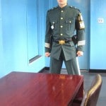 Two South Korean Military Personnel stood in the room with us. We were told they were here for our protection. These two boys were a hoot. They stand with their fists clenched at their sides (which is the traditional ready-to-attack Tae Kwon Do stance). All South Korean Military at the DMZ must wear Ray Ban aviator sunglasses. They wear these sunglasses to intimidate the North Koreans who stare at them 24 hours a day just meters away from the MDL. I peaked out the buildings window and noticed soliders standing half exposed at the end of each of the buildings, facing towards North Korea. We were told they stand behind these buildings with only half of their body showing in order to reduce their chances of being shot while on duty.