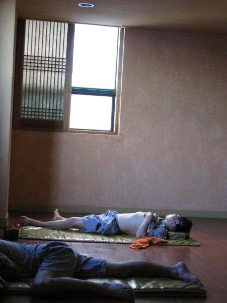 We arrived at the Jimjilbang and were greeted by the owners, a 60 year old couple who shoved pajamas and a locker key in our face before accepting our seven dollar payment. The owners spoke zero English. The man jabbed my chest and then pointed to the door in front of me. The woman grabbed Julia and pushed her in another room. We quickly jerked back and said, “I’ll meet you upstairs!” A Jimjilbang is a large, gender segregated public bath house. Complete with hot tubs, showers, saunas and massages tables. In other areas of the building there are unisex quarters, usually with a snack bar, ondol-heated floor for lounging and sleeping, wide screen TV’s, PC bang, and rooms for sleeping. Jimjilbangs are open 24 hours a day and are a popular weekend getaway for Korean families to relax and spend time soaking in tubs or lounging and sleeping, while the kids play away on computers or watch movies on TV. This Korean Sauna concept is similar to the Japanese Onsen with one major difference: for seven dollars you can use the spa facilities and sleep for the night! There are thousands of these establishments across the country which are notoriously used by foreigners who party hard on a Saturday night and need a cheap place to sleep before they head back to their neighborhood Sunday afternoon.