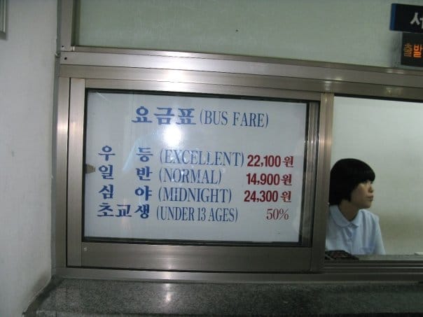 I invited Julia to take the trip with me and we stood at the secretary desk at work waiting as Sun checked his computer for available seats. People notoriously book trains and buses months (if not a year in advance) for this holiday so we were crossing our fingers, legs and toes. We lucked out! There were a few seats left for a bus that left Friday night at 11:30pm. I blurted, “ok book it.” We would finish work at 10pm and have to run home to change, grab our bags and then rush toGuui Station for Seoul Express Bus Terminal.