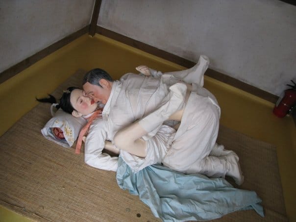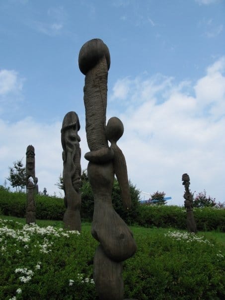 We however, did not come to Sinnam for the fish. The star attraction here is Haesindang Gong-won, a world famous outdoor Penis Park which is full of giant penis carvings. While phallic symbols are nothing new, the origins of this town’s penis fetish are not the usual fertility or stamina preoccupations one would expect. Sinnam legend has it that a young virgin drowned within sight of her boyfriend on a small rocky island offshore. The boy had hoped to save her but was unable to because of the rough seas. Shortly after her death, fishermen noticed that the catch was dwindling and soon the town was sure that this “unfulfilled” girl had cursed the fishing grounds. All hope seemed lost, but when a fisherman heeding the call of nature did so facing the ocean, the next day’s catch increased. Soon the village erected, um, erections in hopes that the penises would placate the frustrated ghost. The fishing yields returned to normal, and Sinnam’s custom of showing Mr. Cock to the water remains to this day.