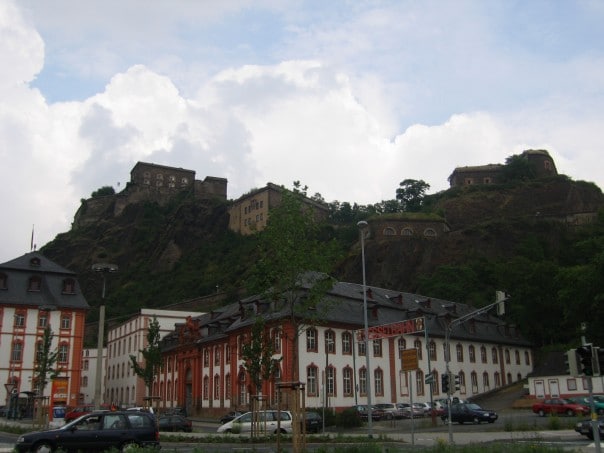 Arriving in Koblenz I walked right to the tourist information to find out how to get to my hostel which is located in Festung Ehrenbreistein (a mountain fortress which looks over the connection of the Rhine and Mosel rivers. Picturesque to say the least). I had to take a bus to the bottom of the mountain which is on the opposite side of the river with respect to the city center. From the bus stop I had to hike through a very dark yet pleasantly cold tunnel which crosses under the mountain to the other side where you can find an old school German chairlift. I paid for a return ticket, hoisted my bag onto the passenger char and ran after my lift before it headed straight up the cliff. Once arriving at the top of the mountain I walked around to get a good view from the Fortress walls. A one minute walk from the chair lift is my little fortress hostel (not so little, I felt more like it had the lay out of a prison). I unloaded my things and took the lift back down to the base of the mountain, crossed the street and got on the ferry which crosses every 10 minutes to the main town of Koblenz.