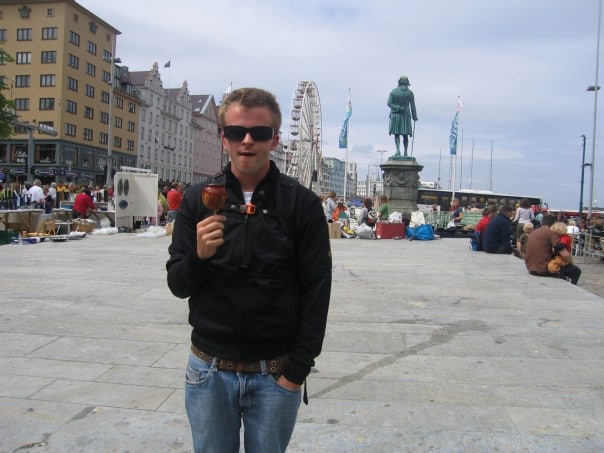 The flight from London to Bergen was a little bit shy of two hours. As we flew over the first bit of southern Norway my heart jumped. The landscape is beautiful and I can see how Bjork wrote Anchor Song on a Cruise from Iceland to Norway…its entirely gorgeous. The landscape reminds me of a mix of West Coast Canada with a bit of Viking lore and Muskoka Cottage country thrown into the mix. On the plane I got my first shot at Norwegian cuisine with the luxurious on board menu including cream cheese and smoked salmon sandwiches, Reinsdyrpolse (Reindeer Sausage) and Elgpolse (Moose Sausage). Everything in Norway is bloody expensive but totally worth it for the fantastic views and rich culture. I feel like I am actually living in a Viking (pronounced Wiking) village, perhaps I’ll see a troll or two! Some history; Olav Kyrre, King of Norway from 1066 to 1093 founded Bergen making it Scandinavia’s first capital city in the 13th century. Bergen was Norway’s largest city for 600 years and is now second to Oslo at a population of about 250 000 people. In the summer (right now) it never gets dark…the sun gets weak at around 11pm but it is still easy to walk around…no dark alleys here. The sun comes back at around 2am in full blast so the night is practically non existent.