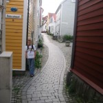 I then took a stroll to the grocery store and purchased 20 euros worth of food supplies for my next 2 days in this historical UNESCO World Heritage city. The grocery store was full of little odd treasures. I bought two of the traditional Norwegian buns that are the colour of Pumpernickel bread and are covered in seeds and oats. I then bought some gala apples and a nice tub of garlic whipped cream cheese. To finish off these wonderful sandwiches I also bought Kylling Salat (chicken salad) and Pepperskinte (peppered ham). During my dinner I met a girl from Montreal and she and I decided to go for a walk around the town before bedtime. We walked to the famous pond called Lille Lungegardsvann where I was able to look 360 degrees around myself and see huge mountains with little Nordic cottages (we’ll call them Hobbit Houses from here on in…they actually grow grass on their roof its like a fairy tale!) We then walked back in the direction of the town square through the University and Johannes Kirken a famous old Nordic church. The architecture is starkly different from that of France or Spain. Amongst the University streets are a gathering of suburbs which are entirely adorable. All of the houses are Nordic little cottages painted bright yellow, red, orange, green and even pink. If you stand in the middle of the cobbled streets and lift up your arms you can literally touch the sides of both houses!