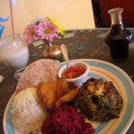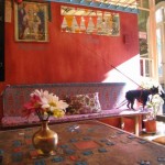 We ate lunch at the cutest little Vegetarian Indian restaurant called Krishna. The ambiance is incredible here as the walls are jammed with portraits of Hindi gods and goddesses. We sat on a long pink, green and purple pillow covered bench and glanced down at our menus while chewing on whole wheat bread smeared with pumpkin puree. Our table was adorned with an incredible assortment of glass, mirror and mosaic with a cute little vase of purple and yellow tulips. We enjoyed a lunch of vegetarian Indian goodness; banana Lassie, millet croquettes, thali (pakoras, raitha, ginger sabji rice, chutney and chapati), Gauranga potatoes (au gratin with cream, ricotta and spices), and cheese crepe with chutneys. The owner pranced through the restaurant throughout our meal in black tights, ballet slippers and a small little toy poodle attached to her wrist by a decorative leash. The sun threw itself through the thin doorway casting dramatic shadows onto the room’s brightly coloured pillows and flickered in the mirror mosaics of the dining rooms table tops. As we were paying our bill we heard the hilarious Spanish version of the song Aicha.