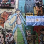 We finally arrived at the touristy Caminito district. The area is about two square blocks and is an essential stop over for all tourists passing through BA. All of the store fronts and houses are brightly coloured with life size paper mache figures representing Tango culture, standing on balcony’s over the street. One of the balcony’s features life size mannequins of Evita, Peron and a famous Soccer player giving a gleeful thumbs up. There are several references to football throughout the area as this is the home of the famous Boca Junior Football Club. The cobble stone streets are lined with artists selling their tango inspired paintings and sculptures. On every corner one can find several scantily clad women dressed to look like Tango dancers (but they come off more as hookers) who try and seduce you into taking a picture with them. I saw one Asian man being groped by two horrifying women wearing bright pink lipstick, he got his moneys worth at least. This little district truly is magical and full of history as it was the birthplace of Tango in the 40’s. We both sat on a fountain step and entertained ourselves by watching a man wearing a pin striped jacket and holding a cigar shouting “come and get a picture with Diego.” It seems anyone in this town will dress up to make a little money behind the camera for tourists. Sarah felt compelled to ask Diego why we would want a picture with him. He was certainly not famous, perhaps that is why the display was so entertaining. We saw two huge tourist buses full of Asians pass by the main road which was our cue to leave. As we walked to the taxi station both Sarah and I laughed as we saw several of these Asian tourists wearing SARS masks.