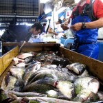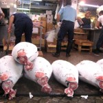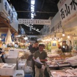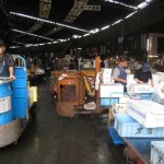 The are two distinct sections of the Fish Market. The inner market (jonai shijo) is the licensed wholesale market, where the infamous tuna auctions and most of the processing of the fish take place, and where licensed wholesale dealers (approximately 900 of them) operate small stalls. The outer market (jogai shijo) is a mixture of wholesale and retail shops that sell Japanese kitchen tools, restaurant supplies, groceries and famous “fresh from the market” sashimi restaurants. The market handles more than 400 different types of seafood from tiny sardines to 300kg tuna, from cheap seaweed to the most expensive caviar. Overall, more than 700,000 metric tons of seafood are handled every year at the three seafood markets in Tokyo, with a total value in excess of 600 billion yen (approximately 5.5 billion US dollars). Tsukiji alone handles over 2000 metric tons of seafood per day. The number of registered employees at the market varies is 65,000, including wholesalers, accountants, auctioneers, company officials and distributors.