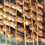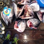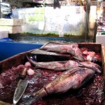 We had arrived after the tuna auctions. Perfect timing as the frozen fish cadavers had been distributed to each of the various market processing areas. The wet floor was covered in large frozen tuna carcasses. I stood carefully in between two severed tuna heads (which are approximately the size of a large pizza) and watched as skilled men used massive bladed machines to saw each fish into sections. Each of the sections was then manually de-boned with the utmost care. Throughout the market I noticed many piles of leftover Tuna remains. Heaps of bone sitting on the floor without a trace of flesh. Which makes sense, since tuna sashimi costs an astronomical amount over here. Once de-boned, master sushi artists work away cutting the flesh into various sized steaks. These hunks of raw tuna range in size from large to very thinly sliced tuna sashimi ready for consumption. After seeing several hundred thousand dollars of raw tuna I told Kat I thought tuna fish popsicles would be a very lucrative and innovative business venture.