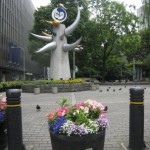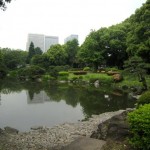 I continued across the street and within minutes I was walking through Hibiya Park which is spotted with lily ponds and sculpture filled gardens. On the other side of Hibiya a stone bridge straddles the Imperial Moat. Inside the Imperial Palace Gardens hundreds of oddly shaped trees stand on a grassy grid, perfectly equal-distance apart from each other. In the hot midday sun several homeless men lay curled under these Dr. Zeus tree branches. The Palace is not open to the public but tourists flock to the entrance in order to take pictures of the famed Nijubashi entrance. A beautiful Edo decorated stone bridge stands over the river and a cute little Shogun castle sits above it flanked by soaring trees.