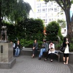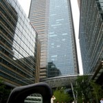 I keeled over after arriving in Midtown as I would never have thought that the ingenious builders of Tokyo could have outdone the Roppongi Hills concept! I’ve learned to never be surprised by what I encounter here. The entrance of the Tokyo Midtown complex really does require the viewer to sit down and just stare. An investigation with the eyes. A massive stone organic doughnut sculpture sits beside the sidewalk. An odd looking water fountain which doubles as a waterfalls runs through the center of the space. The ground is made up of a mix and match of polished stone and wooden planks. On either side of the fountain stand patches of bamboo grove which sway in the wind like long strands of grass. My favorite part of this modern Japanese park were the contemporary benches made of mahogany wood that slope down on an incline like that of a skateboard ramp. I lay across one of these benches entirely comfortable and content while staring up into the sky at the cities tallest buildings. I was reminded that nature still does exist in the core of the metropolitan as the smell of perfumed flowers hit my nose and bamboo twisted and turned in the sky above.
