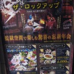 I stood outside of The Lockup for Kat. We hugged with big smiles smacked across our faces as we headed downstairs for the entrance. The Lockup is a famous Tokyo based theme restaurant (there are three in the city). It takes a few minutes to get from the main entrance of the restaurant to the hostess table as each patron must walk through a dark haunted house to get to their table. I thought the haunted house was a nice touch. Screaming men in electric chairs, glowing aliens and dungeon rooms. Once we pushed through the main door a beautiful woman dressed as a scantily clad Prison Warden took our reservation name. She took my hand and snapped a single handcuff to my left arm which was attached to a long chain. She then walked me through the dimly lit bar to our seats. We took off our shoes and crawled into our small prison cell. A wire gate was snapped shut and we were locked in. As we chatted over our menus we could hear other patrons coming through the haunted house as they screamed in fright. Throughout the evening I could hear the click clack of the Hostess/Wardens high heels and following her long chain I could see the terrified and giggling dinner party following behind her. I often screamed or moaned from our cell to terrify them a bit more. I love an interactive feast!