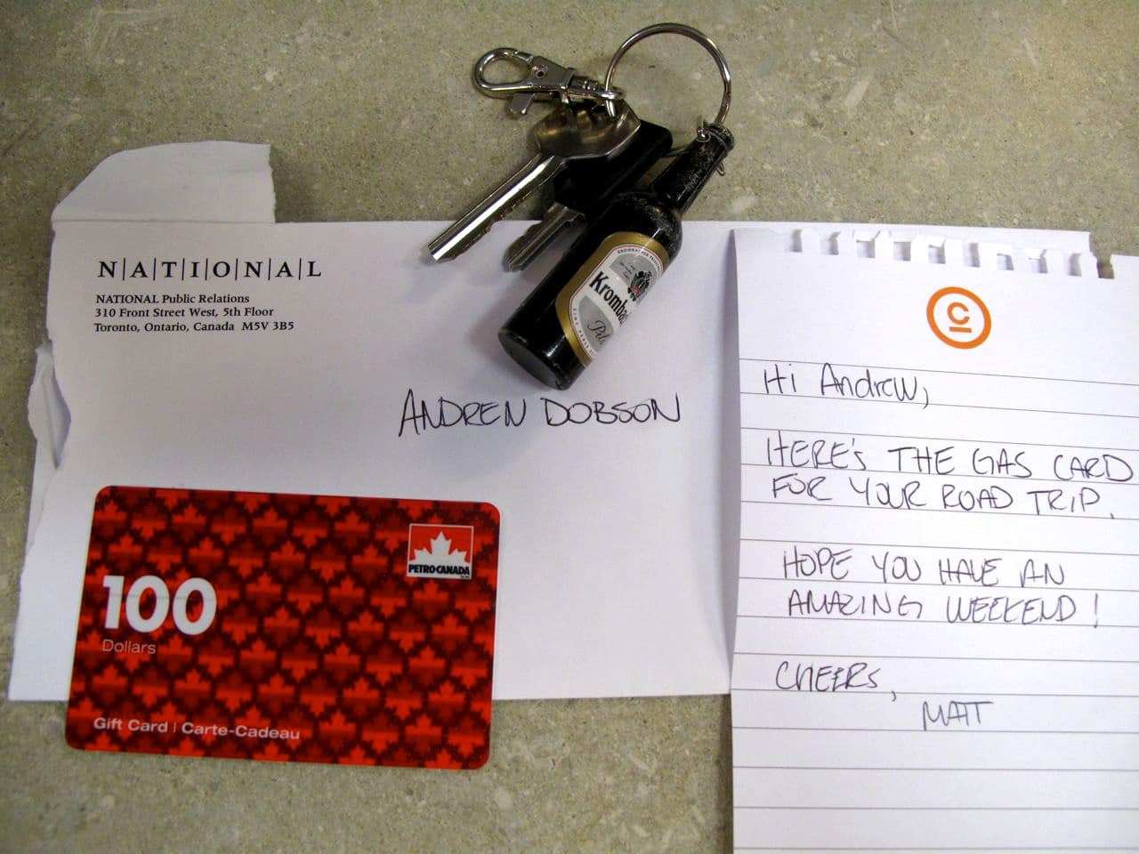 The car was dropped off right by my office at King and Spadina on Friday at 4pm. When I finished work at 5pm I immediately unlocked the car and hopped into the back seat of the car for a nap. I was so pleased to rest my head on warm black leather and slowly sigh as the delight of “new car smell” filled my lungs. After a short nap the gang arrived. We were all giddy with anticipation and ready to hit the road. I quickly stopped into the Tim Horton’s across the street and bought us all an Iced Cap and a box of donuts to tie us over.