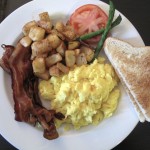 Two Scrambled Eggs, country potatoes, bacon, toast and preserves