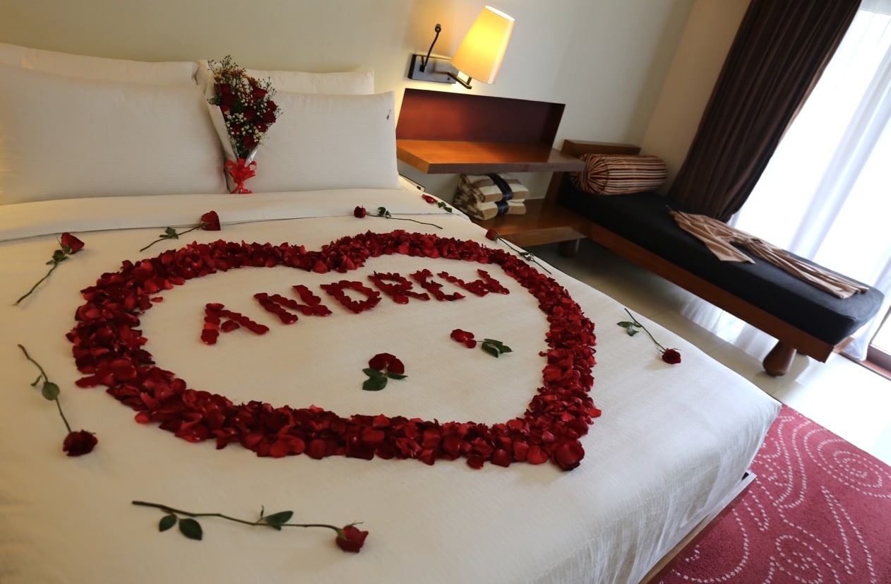 Suite amenities include plush king sized bed, relaxing lounge, oversized bath and shower, mini bar, espresso machine, Bose Bluetooth Speaker and IPTV Entertainment System with free movies on demand. Honeymooners step into their suite with a wow, greeted by a bedspread topped with a heart made of rose petals and swoon-worthy bouquet.