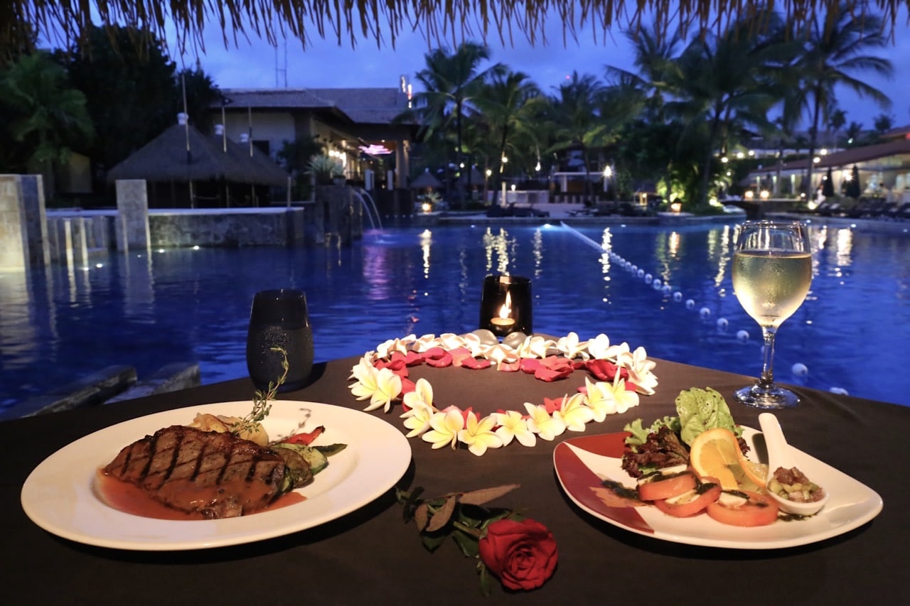 If you’re the sort of gent that likes to surprise your sweetheart, keep your Cabana Romantic Dinner booking a secret. After enjoying a cocktail at sunset skip down to a choir of cabana’s and wow your special little someone with a fine feast perched over the pool. You’ll arrive to a petite space romantically decorated with a series of rose petal hearts which set a perfect mood for a finger-licking-good set menu featuring Ahi Tuna with Avocado, Tomato and Buffalo Mozzarella with Pesto, Char Grilled Australian Beef Sirloin and sweet Strawberry Shortcake.