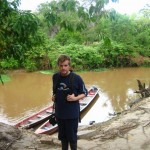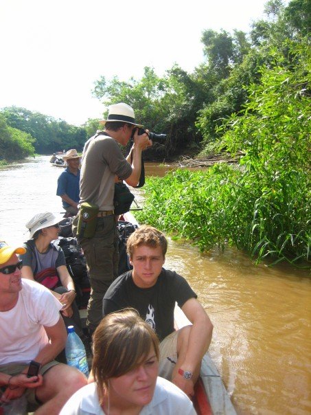 We hopped back into the Jeep and drove a short 25 minutes into a small town where we stopped to eat lunch. We were given little spiny orange fruits the size of small plums which tasted a lot like Lychee. You basically suck the thin layer of white pith around the nut. They also make a fresh juice out of the stuff. It is sour like white grapefruit. We ate fried beef, rice and fried banana while the hilarious Belgian man discussed the history of Belgian Beer (according to him, Budweiser tastes worse than piss). A local man walked into the restaurant and displayed his hand made alligator boots which I wasn’t at all inclined to purchase. We drove ten minutes down the road and arrived at a small riverside village (consisting of two huts). At the riverbank several brightly coloured wooden longboats bobbed up and down on the shore. We were soon embarking on a two hour boat ride up the river. Essentially everyone smeared suntan lotion and 100% deet all over their bodies. Our guide attached a thirty horsepower motor onto the back of our banana boat and we were soon driving up a scorching hot, lush jungle.
