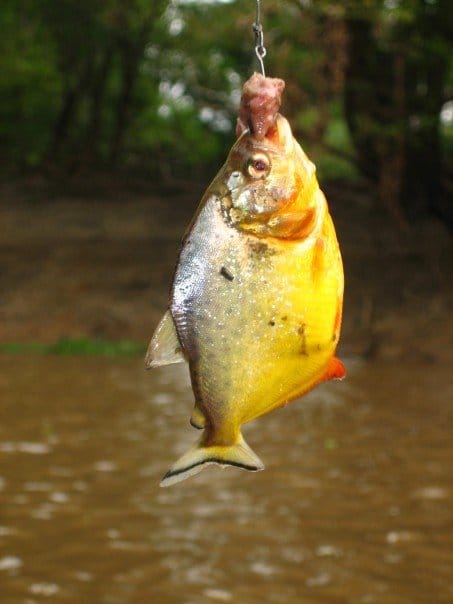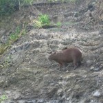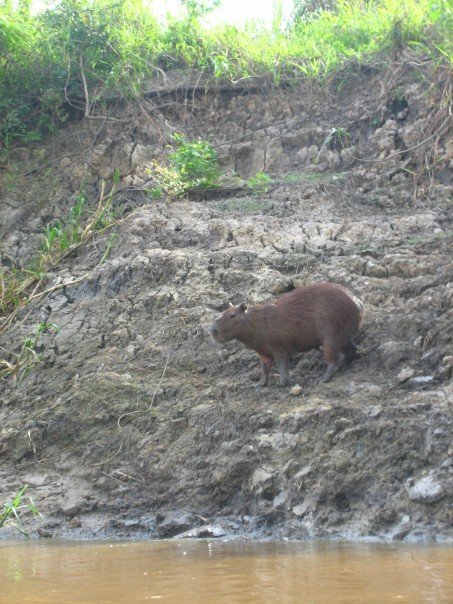We spent the afternoon Piranha fishing, how exotic I know. We were all given rectangular pieces of wood with fishing line and a hook. We baited our hooks with little pieces of beef and dropped our lines in the water. It soon started to rain so we were all huddled under our rain coats. We were only getting nibbles by small sardines so we moved the boat to a better location. The rain let up and we soon followed the lead of our guide technique wise. The best way to catch a Piranha is to throw your line over a branch by the shore and slowly lower it just above the water. The Piranha will jump out of the water to grab the bait, you yank, and you’ve got yourself a Piranha for dinner. We ended up catching about five colourful little sharp toothed fish which was rather exciting. As we puttered back to the lodge we saw a huge family of Capybara which hands down have been our favorite animal in the jungle. They are the world’s largest rodent. The size of a large farm pig. They are brown, hairy and look a lot like large beavers without the distinctive flat tail. For dinner we ate grilled Piranha, pasta, grilled vegetables and a hilarious cake. I suppose they made us a cake as it was our last night on the trip. The top of the cake was decorated with saltine crackers. I almost had a fit laughing, crackers on a cake, brilliant.