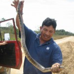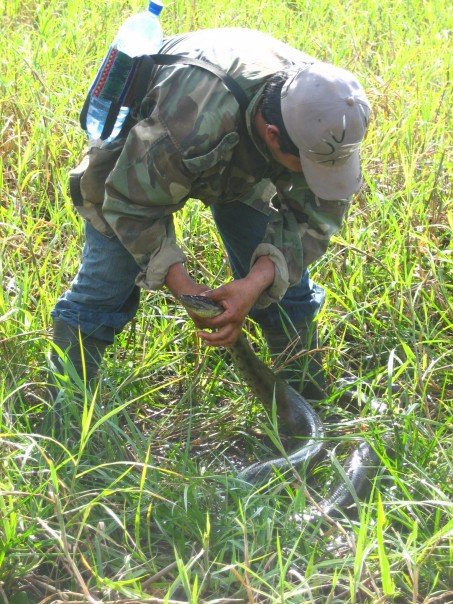 We drove our boat into the mud and walked past a small farmhouse before arriving at an expansive grassland. We were moments from beginning our Anaconda hunt. I do NOT like snakes and this was the most difficult adventure for me. I really had to force myself to try something new and get outside of my comfort zone. The flat lands were incredibly hot. We were all sweating wearing our soggy rain boots. I walked directly behind our tour guide who had a huge knife attached to his hip. I began to ask him a few important questions such as: how many of the snakes in this field are venomous, what does one do if they come across an anaconda etc…
