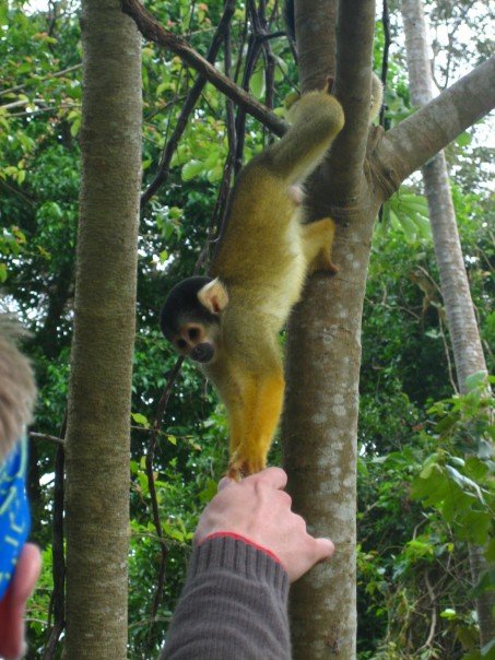 In the morning a group of hardcore people (not including me or Sarah) woke up at 5am to watch the sun rise over the river. They arrived back at camp at 8am and we were soon woken up by the crazy Belgian man screaming like a monkey. Breakfast consisted of crepes, dulce de leche, grapefruit, orange, papaya, banana and cheese empanadas. The group told us that the boat ride in the morning was rather thrilling. Piranhas are rather hungry in the morning hours and three of these carnivores actually jumped into the boat as they headed down the river. How terrifying, if a Piranha jumped through the air and landed on your neck, or ear or cheek. As we wound our breakfast to an end the most exciting thing happened. Hundreds of small little squirrel monkeys seemed to be passing by the camp. Jumping from tree to tree and scurrying over the wooden bridge in the distance. I got up and ran over with my camera to take pictures. The rest of the group came by with fresh fruit to feed them. The monkeys came right onto our hands and grabbed pieces of fruit. I had monkeys inches from my face, they are adorable. Sarah, being the debby downer, reminded me of the film Outbreak and the slightly terrifying Abola virus that was transmitted by a similar animal.
