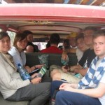 As all of our bags were being thrown on top of the jeep roof a man in an odd little motorized vehicle came by selling banana and chocolate cake. Several people had already met him and he is actually featured in the Lonely Planet as the crazy man in town. One may put him in the category of evangelical cult leader. His little car has banners reading “The Da Vinci Code is Ridiculous,” and “Evolution is a Fairy Tale for Grown Ups.” When you buy his baked goods he gives you a thick pamphlet on what his cult believes. He started preaching about random ridiculous things. I told him the Da Vinci Code was a work of fiction and he huffed at me. I soon found out he hadn’t even read the book. This guy was somewhat biased I’d say. I walked away really irritated and everyone was laughing as we hobbled into the jeep. He yelled back at me, “I have quotes and proof, this is real!” Two words, Wack Job. Everyone in the Jeep was hysterically laughing as Sarah read out some of the ridiculous statements in the handout literature. His cult claims that evolutionists created AIDS and cancer to control the human population. He also claims that the Catholic Church is mentioned metaphorically in the book of Revelations as a heartlet. Most absurd, he actually claimed that Christianity was the only faith that could be historically proven. Apparently Hindi and Islamic faiths don’t have a lot of archaeological evidence to support their views. I would die to see Tom Cruise and this man have a rancid debate. We all realized we had just financially supported a cult leader through our purchases of baked goods. In the middle of the jungle it seems like the hungry stomach comes before moral standards perhaps.