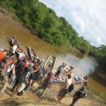 I guess I couldn’t complain as we all were in the same situation. We even debated asking a local how much we could pay to get a drive down the road to the next town where we were supposedly meeting our Jeep. The hour walk seemed like three hours of hell. Every few minutes the guide would tell us “just another ten minutes.” I would get all excited as soon as I had walked down a long stretch of road, turned the bend and my heart would sink as another few kilometers could be seen in the distance. The dirt road we arrived on was now a torn up clay and mud trench. Huge trench’s three feet deep ripped through the center of the road. We all assumed there had been a bad rain and the passing trucks and 4×4’s had destroyed the road. Sarah and I had backs that felt like they may break. I wanted to scream and cry a few times as my ankles felt they may snap under the pressure of my bag and rocky road we had to hike across. We passed by a local poverty stricken village which featured open concept huts with kitchens that were basically large rocks for preparation and a fireplace for cooking. We could here the faint sound of tribal music, turned a bend and saw a huge crowd of people.