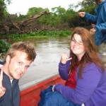 For lunch we gorged ourselves on chicken fried rice, grapefruit juice and cucumber salad. Our guide stopped by the table to apologize for the disorganization of the trip. He explained that it is very hard for anyone in the tourism industry as the government hasn’t invested any money into this sector of the economy. They spend all their money on the oil industry out of the wealthy city of Santa Cruz. It was rather touching as he said “even though we don’t have degrees, we know a lot about this area.” These native guides were once hunters and are now avid conservationists. We packed all of our things up and carried all of our bags to the boat. Sarah and I were adamant about getting the best seat. On the drive up river we had been sitting in the front on a plank of wood with no back support. Uncomfortable to say the least. We grabbed the back bench with all of the backpacks directly behind us. We leisurely reclined against these packs for the next two hours with our legs stretched out across the boat. We plugged in our iPods and giggled as our feet were tickled by the reeds and lily pads that brushed against the soles of our feet. I stared up into the blue sky with huge outstretched trees that seemed like they were diving into the water as a white heron flew directly overhead. I felt like I was in some sort of jungle film, the moment was perfect.