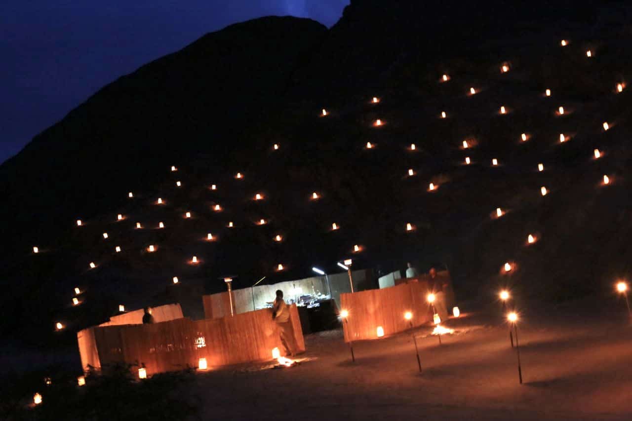 After a quick freshen up at the hotel we hopped in a van and crawled through a remote moon inspired landscape. And just as we turned around a bend in the road I spotted a table covered in cheese and oyster platters where two attendants enthusiastically poured glasses of sparkling South African wine. Our first sundowner of the trip, offering an unforgettable opportunity for us to take in the sunset as it crawled across the desert. We thought we had just been treated to the sweetest snack but the night had really just begun with its tricks and treats.