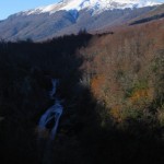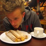 We finally stopped in the town of San Martin los Andes where we had lunch with our two Parisian friends. We all shared a bowl of potatoes, salad and devoured a huge plate of veal Parmesan. We walked down to the beachfront and took some pictures of the lake and surrounding mountains and then quickly walked back to the square to meet up with the group again. The bus drove back to Bariloche in about three hours, stopping twice at a beautiful river (as we approached the river the tour guide exclaimed in Spanish ¨prepare yourself for the most unforgettable place on earth. Mountains, river, lake and forest…what more could you ask for.”) We chuckled in the back seat as she continued to play up the scenery. Our last stop was at a gorgeous little lookout; to the left we could see the sun setting on snow peaked mountains and to the right looking down we could see a red and orange forest and beach front covered in evening shadow. We were now freezing as the Patagonian foothills are certainly a chilly local. The last hour of the drive we fell asleep under the stars as the bus curved across the desert towards the glowing city of Bariloche. Sarah and I enjoyed our trip but wished it had been a half day adventure as twelve hours is a bit draining. We also thought it was rather funny that tourists actually do this full day trip because we (as Canadians) are used to these views in the West Coast and Muskoka regions. We realized that we take for granted our countries many lakeside views and mountain vistas. Sarah and I headed to the hostel bar for free dinner to realize it was a vile spinach and egg custard. We decided to walk downtown at 11pm for a bed time snack. We shared six sugar coated churros and hot chocolate before heading back to bed for a cozy sleep.