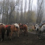 We left the following morning at 10am for a half day of Patagonia Argentinean cowboy adventures. The bus picked us up and five others from our hostel. A mother and daughter from Bristol and two friends from Ireland. The short 25 minute drive outside of the city to the hillside ranch was enjoyable. The temperature today was -2 degrees and I knew as we drove across the sheep filled desert that we would be freezing our fingers off. I had no clue what to expect as I had not been horse back riding since I was a wee child. I was a bit terrified actually. I have never enjoyed sitting on powerful beasts with zero control of my bodily security. We drove up to the huge farm property. A small little farm house spewing cedar smoke from the chimney greeted us as we got out of our little bus. The ranch has over fifty horses and it was really fun to stare at all of them over the fence as they mulled about. They had about every size and colour you could imagine. I jokingly asked if I could be placed on a mule, donkey or baby horse as I didn´t want to have to sit on a huge stallion for two hours. We sat in the farmhouse for a few minutes drinking hot coffee, tea and Elmate in front of a huge raging fire. Elmate is the traditional drink of Argentina. The cups fit in the palm of your hand and are usually made of metal or leather. Locals fill them with a tea-grass mixture and pour hot water into the little cup. They sip on this swamp like mixture with an ornate metal straw which filters out all of the vegetal garbage. Sarah tried a sip of it and almost vomited. Apparently it tastes incredibly bitter and a combination of dried vegetable and stale crackers. Argentina´s cowboys love it. To each his own I guess.