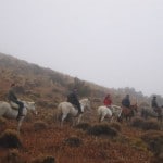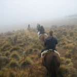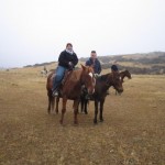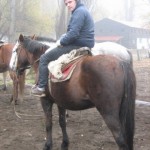 I had no clue what our trip would entail but here is a brief synopsis: we pretty much followed the horses in a line over a river (which was terrifying for me as my horse refused to cross and Sarah´s horse stopped all together to take a shite and drink some water). Sarah’s horse was rather awkward, it farted all day, shit and constantly stopped to eat grass and drink water. She was always at the back of the line it seemed. The cowboy led us up a very steep hill which terrified me. I clung on for dear life basically. The scenery was beautiful. We were horse hiking through the Patagonian foothills. I kept thinking ¨pinch me¨ this is ridiculous. We were climbing through desert surrounded by mountain top fog. The foliage was beautiful: yellow and black long wild grasses, pine forests and prickly little bushes (which scraped my calves as my horse bounded through the mountain tops). We crossed a huge valley and entered a thick cedar forest before we arrived at a vast open field. At this point my heart jumped out of my chest. As soon as the horse realized it was on an open field it started to full speed gallop. I screamed like a banshee as my horse pounded across the barren desert floor. I felt like I might die. I also realized how painful it is to gallop as my ass was bruising itself as I sped through. The two men from Ireland were complaining about their ¨bruised family jewels¨ which had me in hysterics.