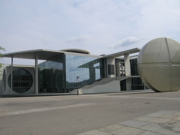 I walked south down Erbertstrabe and arrived at the Holocaust Memorial. The memorial is huge and took four years to build. The entire plaza contains rectangular pillars about 3 feet in diameter. The actually memorial is an optical illusion and is meant to make you think and ponder the events of WWII. Bellow the plaza is a Holocaust museum which contains many artifacts and 10 videotaped testimonies from Jewish survivors from Berlin. I enjoyed taking many pictures through the huge maze of black columns. The architect of the memorial is a genius, in the center of the memorial all of the columns are very tall (about 15 feet or so) and the footpath is flat and linear. On the sides of this main street are rolling artificial hills, so if you zig zag across the memorial you walk up and down waves of land with huge columns surrounding you 360 degrees. An amazing artistic achievement and beautiful memorial.