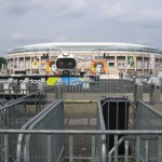 I was up and at’em at 9am this morning and walked through the back of the forests to my bus 115 stop into the city. I asked an elderly lady with a very thick accent if I was taking the right bus and she was elated when I told her I was from Canada (she gave me a big smile and thumbs up). I arrived at Unter den Linden and walked to Pariser Platz where several streets and the square are blocked off to traffic. In the center of the square is a giant soccer ball and walking under the Brandenburg Gate you can see FIFA World Cup posters everywhere. On my walk west I arrived at Tiergarten which houses the famous German Parliament called the Reichstag on the Spree River. Across from the Parliament is a huge stadium with posters of famous football players such as David Beckham plastered onto the exterior walls. There were many ticket booths in front of the stadium and even more tourists snapping a million pictures a second. The city planned well for the tourist influx as there are FIFA info centers throughout the city. I asked a young gentlemen about the stadium and he said it isn’t actually the one the games are played at. He said that the stadium was built for the world cup, to those who were unable to get live tickets. Inside the stadium they create a communal exciting atmosphere for fans who watch the game on huge tv screens!
