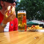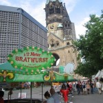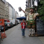 I left the gallery and walked to the huge train station Hauptbahnhof. The Spree river curves right in front of the station and you can instantly tell that the city had prepared for the surge in tourists for the World Cup. Huge soccer shoes and soccer balls the size of houses can be seen across the station. Along the streets (which used to be grassy park areas) artificial beaches can be found. The city filled all of the side streets with beach sand, volleyball nets, pools and even four poster beds for tourists to hang out and grab a beer and do a bit of dancing and cheer. The station was packed with people as they are all arriving today and tomorrow for Friday’s huge game here in Berlin featuring Germany VS Argentina! I have become somewhat of a World Cup addict and can’t wait to see that game. I took the tram to Zoologischer Garten and was amazed to find an immense street party going on. The space (one of the busiest squares in Berlin) has been turned into a party for all football fans and tourists alike. The streets are lined with buskers, tents that advertise 1/2 meter sausage, beer gardens and Chinese/Turkish food stands. I bought my first German Sausage (very excited about that). The lunch was grand and consisted of a foot long Rostabratwurst, French fries with curried ketchup and a half liter of Maisel’s Weise beer. I sat on the bench looking over the street party (which is actually 3 blocks long so just imagine a REALLY big party in both directions and you’ll get the general idea) and enjoyed listening to the German rock and folk music blasting into the air as well as watching the many Argentinean fans getting verbally abused by German locals.