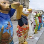 I left the Museum at 1pm and spent two hours walking the streets in search of an excellent affordable lunch. I walked up the main street Friedrichstrabe and came across some interesting sites before I sat down to eat. At the Bebelplatz (the square is surrounded by the National Library and University) there is a huge amazing outdoor international art exhibit. Arriving at the square you can see a huge circle of 198 bears! Each bear has been decorated by a famous artist from a different country. The place is so fabulous as each bear has a plaque at its foot with the name of the country, artist and flag. It is so cool to see how each country expresses itself through the simple decoration of a bear statue! The Canadian statue was actually horrific (it was a mosaic of broken English tea cups…boring and defiantly not a good way to canvas our country). I took so many pictures for all of my artsy friends to show when I get home. Walking north I crossed the bridge to finally set foot onto the Markisches Museum (Museum Island). It is convenient that all the major national museums are located on this one island in the middle of the city. I walked past the huge (and dirty) Berliner Dome (a domed emerald green cathedral that could use a soap scrub). At this point I was famished and happy to find a nice Italian restaurant with a lovely outdoor patio overlooking a very comical interactive fountain (the fountain is the shape of a square and in the center has laser sensors which can detect when you come close to the fountain. When this happens the actual water where you are standing stops shooting up into the air so you can enter into the center of the fountain). I ordered a very large glass of Herforder beer and was served a plate of fresh bread with marinated olives. The pizza was gigantic and topped with spicy German sausage, olives and a magical cheese from Northern Germany (it looks like feta but has the texture of cream cheese and tastes spicy!) As I ate my last bite (prior to exploding) I realized how much I appreciated the cheep food and beer here in Germany. Two weeks in Scandinavia will make for many sober moments, this is a nice change!
